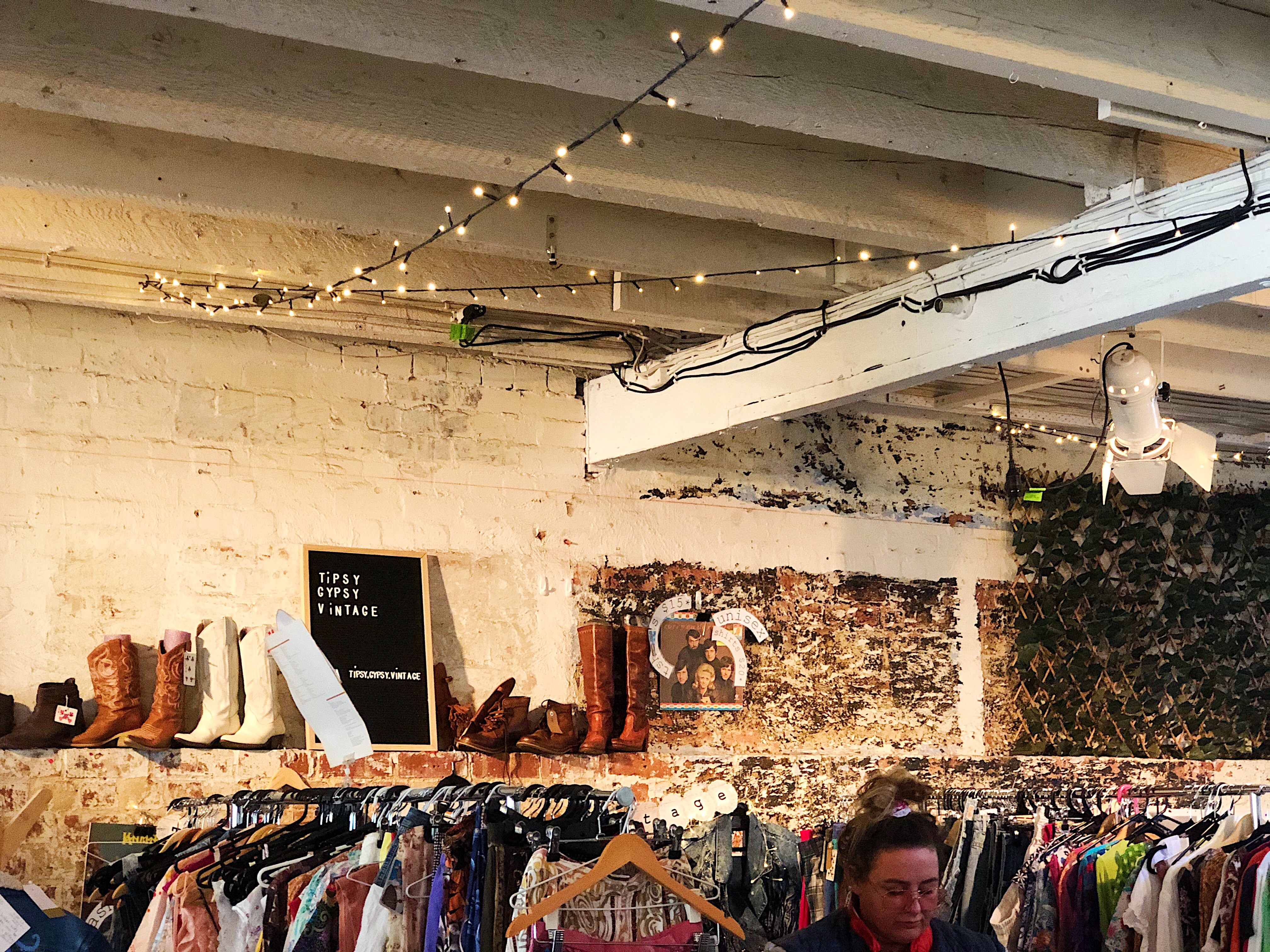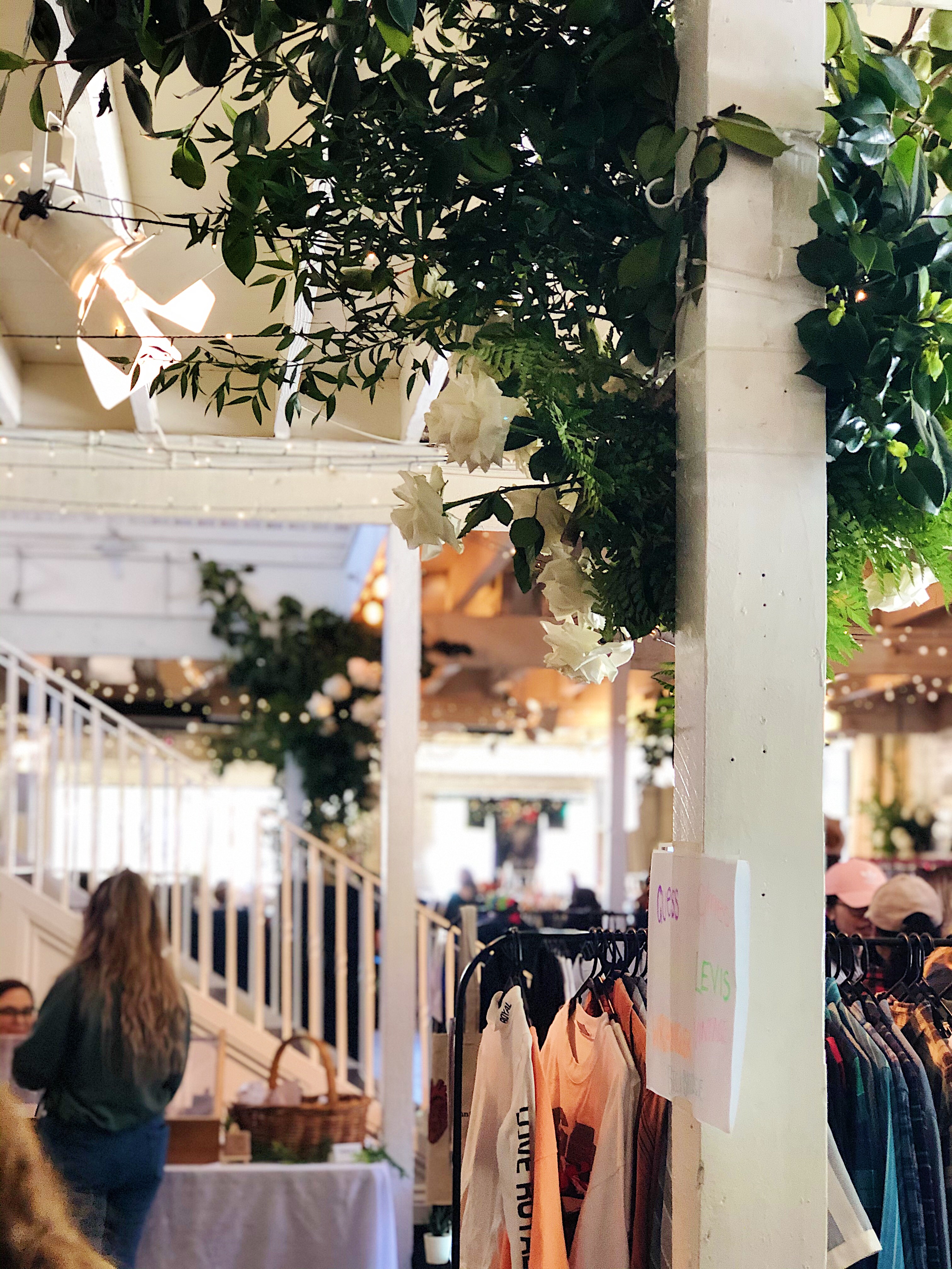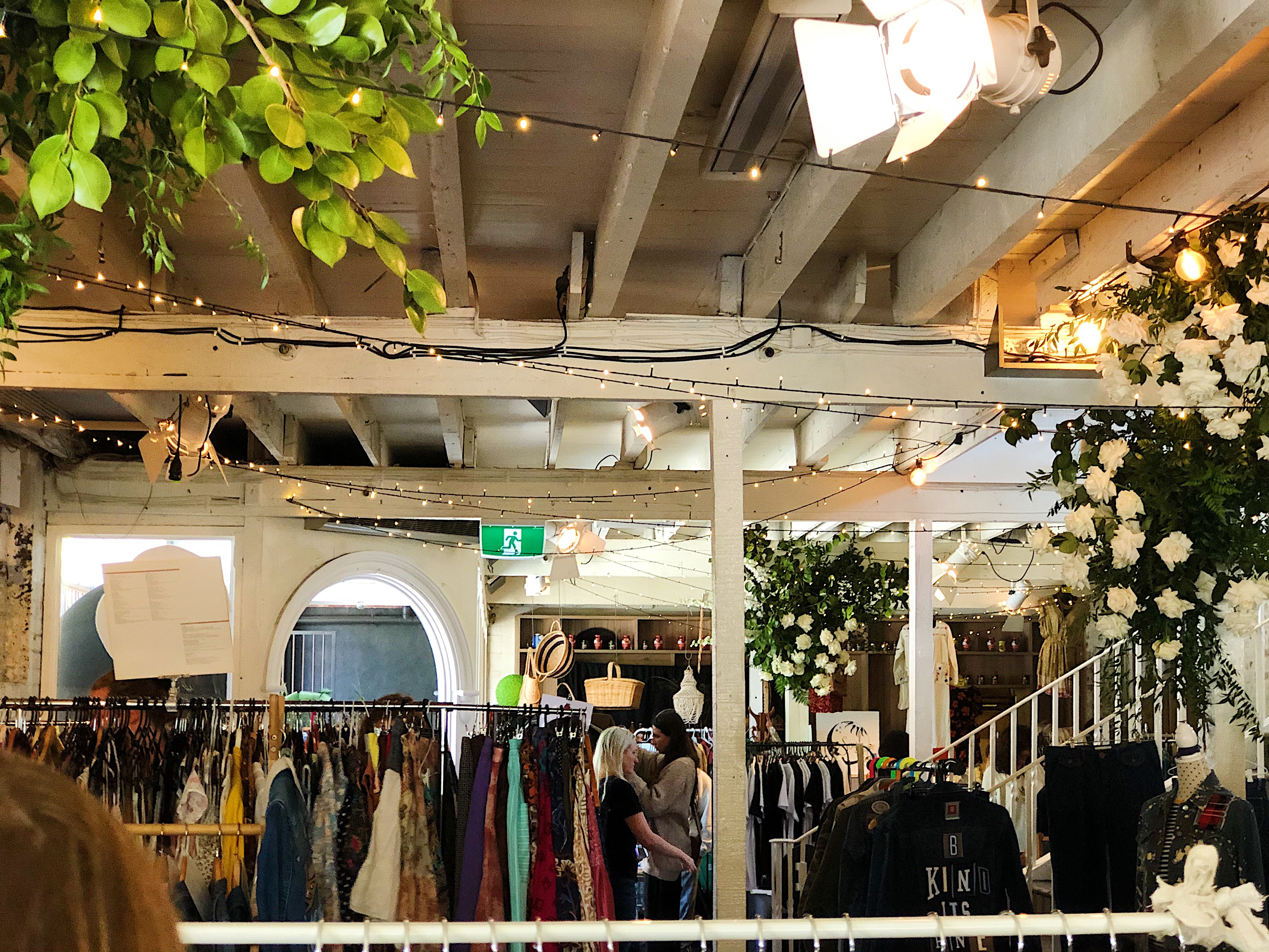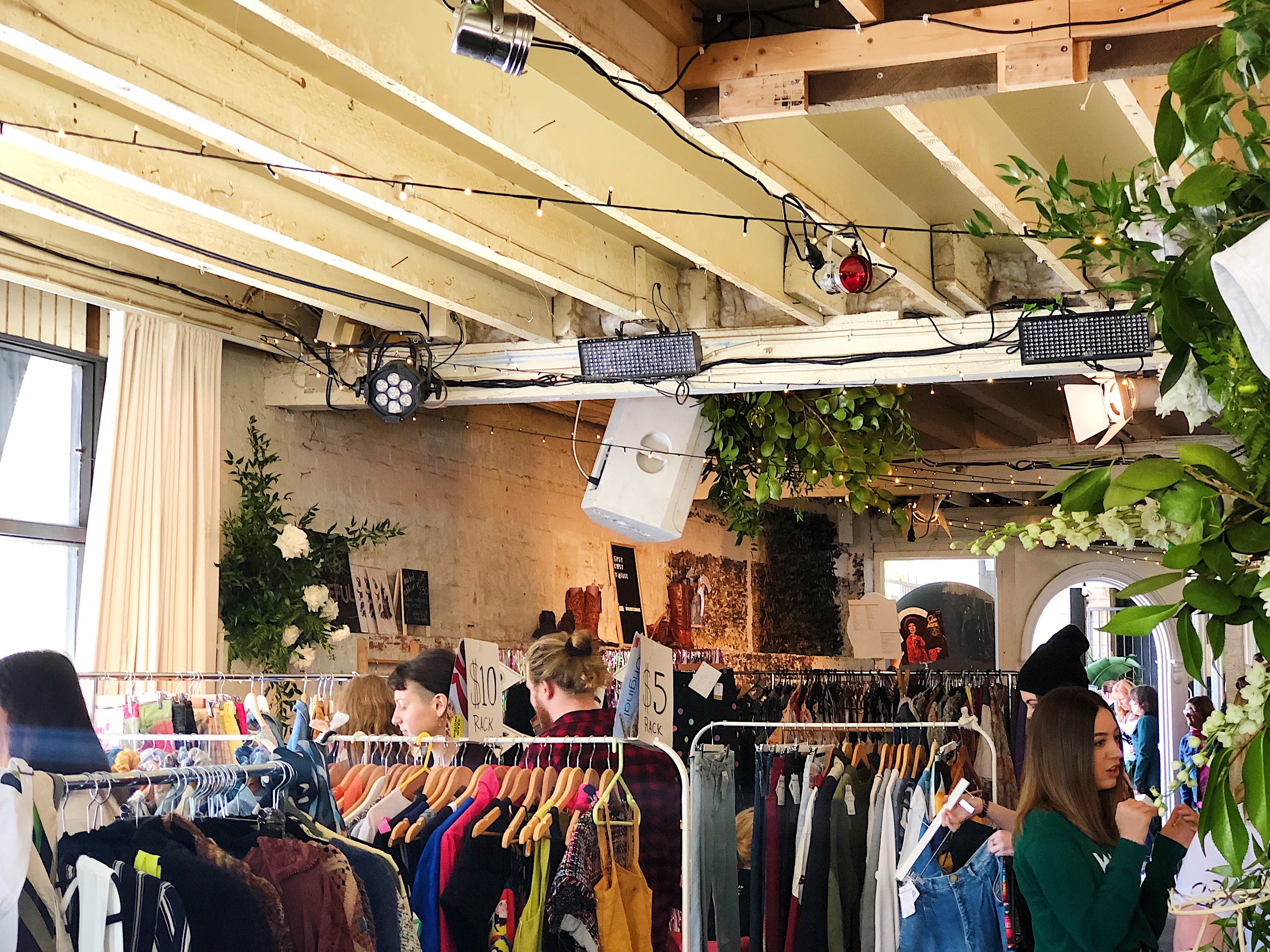 Walking in we were embraced with the sound of music trickling through speakers mounted on the walls, mixed with the chatter of vendors and customers as people wandered through the room. Bright colours, leafy greens and fairy lights decorated the space, transforming it into a vintage aesthetic dream. The afternoon sun filtered through the wide windows on each side of the building, washing the room in a warm, yellow glow. And racks upon racks of vintage, thrifted, and sustainable clothes, jewellery, and local artwork lined the walls, each stall waiting to be explored.