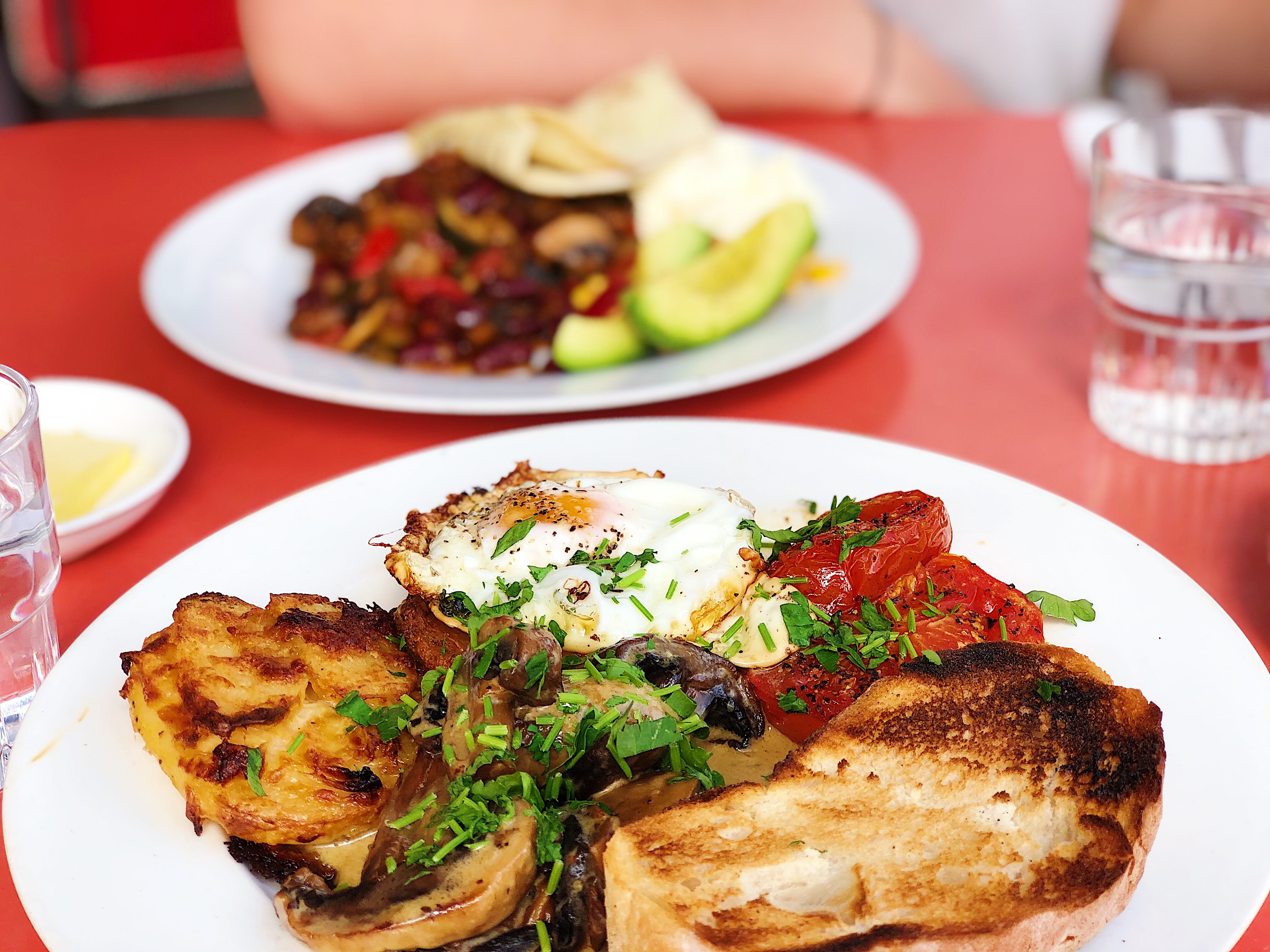 My plate was sent straight from vegetarian heaven. Fried eggs, seasoned with a series of spices so tasty I was sure salt and pepper would no longer satisfy me from that point on. Buttery toast, potato dauphinois, pan-fried tomato slices and mushrooms drizzled in a creamy sauce. No words were been exchanged as we eagerly tucked into our veggie feasts.